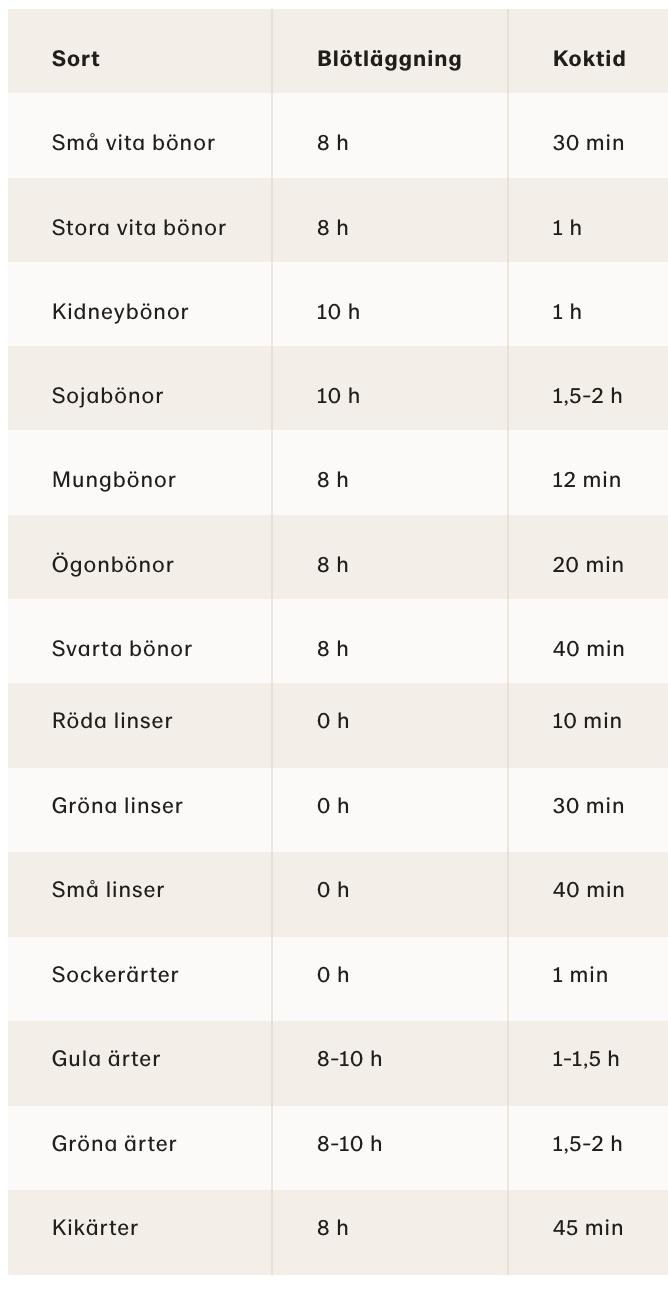 Baljväxter behöver blötläggas för att ämnen i den som kan störa matsmältningen ska brytas ned och stärkelsen beredas för kokning. Angivna tider är den kortaste rekommenderade tiden för blötläggning. Bönor och ärter kan med fördel blötläggas i upp till 24 timmar