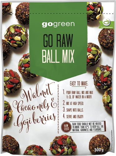 - GO RAW Ball Mix innehåller valnöt, kakaonibs och gojibär.