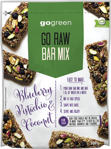 - GO RAW Bar Mix innehåller kokos, pistage och blåbär.
