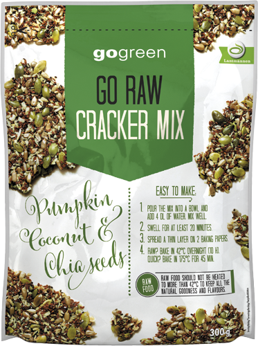 - GO RAW Cracker Mix innehåller kokos, chiafrön och pumpakärnor.