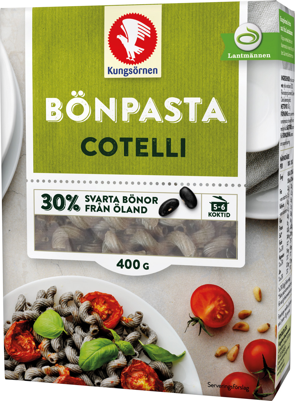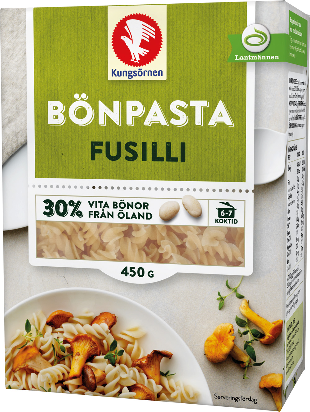 Kungsörnens bönpasta tillverkas i sörmländska Järna och utöver 30 % bönor innehåller den även europeiskt durumvete av högsta kvalitet.