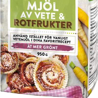 - Vetemjöl med rotfrukter innehåller 10% mjöl gjort på morötter och palsternackor, vilket motsvarar 704g färska rotfrukter. Passar till kanelbullar, pannkakor och bröd.